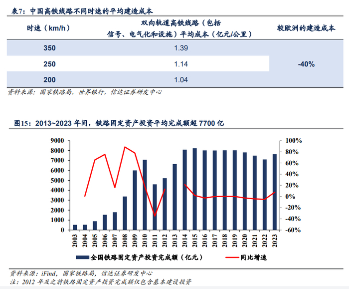 高铁线路技术规范是标准化的,针对不同时速铁路技术标准均有明确规定。高铁线路建造成本上,时速350公里的双向轨道高铁线路(包括信号、电气化和设施)平均成本约为1.39亿元/公里,时速250公里成本约为1.14亿元/公里,时速200公里约为1.04亿元/公里,比欧洲的建造成本至少低40%。同一条线路,采用时速350公里的轨道标准成本要比时速250公里的成本高出10%~30%。回顾过去国内铁路固定资产投资额,基本维持高基数。2013~2023年间,铁路固定资产投资平均完成额超7700亿。
