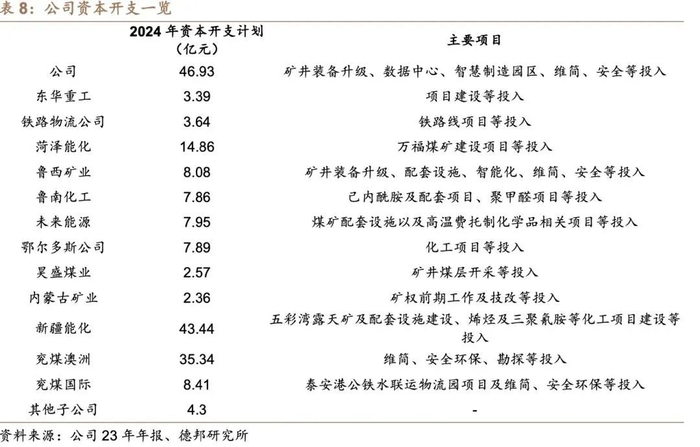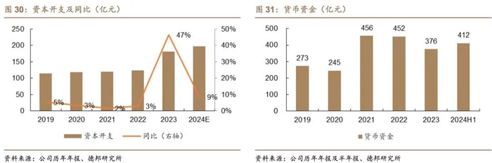 资本开支增速平稳,货币资金充裕。根据年报披露,公司2023年资本开支为181亿元,同比增长47%,2024年公司计划资本开支197亿元,较2023年增速放缓38PCT,其主要开支为在建煤炭矿井及各园区化工项目。随着重要在建工程陆续完工,我们预计后续资本开支规模将趋稳。