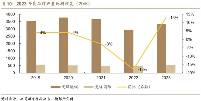 环境因素改善,澳洲生产逐步恢复,澳大利亚在2021至2022年间遭受了拉尼娜现象的影响,强降雨增多,影响矿山正常生产及相关的运输基础设施运行,导致公司澳洲的商品煤产量在 2021和2022年间持续下降,年度降幅分别为-3%/-18%。随着2023年拉尼娜现象的减弱和公司矿山排水能力的提升,生产正在逐步恢复。此外,兖煤澳洲在莫拉本的选煤厂完成了产能扩张至1600万吨的项目建设并已投产,随着投产后现有矿山的洗选效率提升,预计2024年的澳洲权益商品煤产量将同比实现增长。