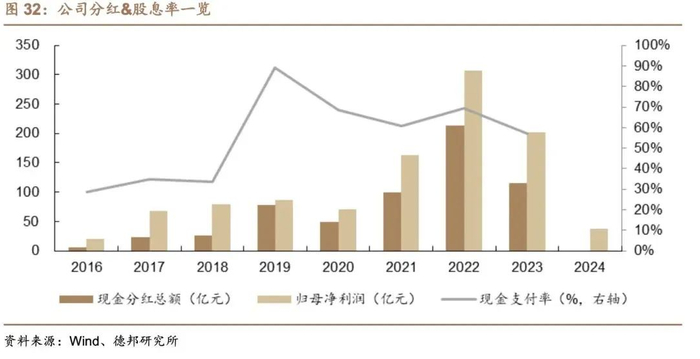 现金分红优异,股息率排名前列。公司于2023年发布《关于确定2023-2025年度利润分配政策的公告》,公司提出将2023-2025年度利润分配政策确定为:在各会计年度分配的现金股利总额,应占公司该年度扣除法定储备后净利润的约60%,且每股现金股利不低于人民币0.5元。根据利润分配方案,2023年公司拟派送红股0.3股,现金分红公司115亿元,占归母净利润的57%,占扣除法定储备后净利润的60%,对应2024年9月2日收盘价对应A股股息率为10%,H股股息率为16%。