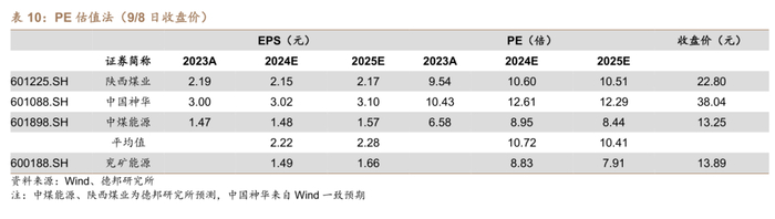 在 PE 估值法下,我们选取了陕西煤业、中国神华、中煤能源与公司进行对 比。我们预计随着在建项目逐步释放,预计公司2024-2026年合计收入分别为1455/1494/1528亿元,归母净利润分别为149/167/172亿元,EPS分别为1.49/1.66/1.72元,对应PE分别为8.83/7.91/7.63倍。