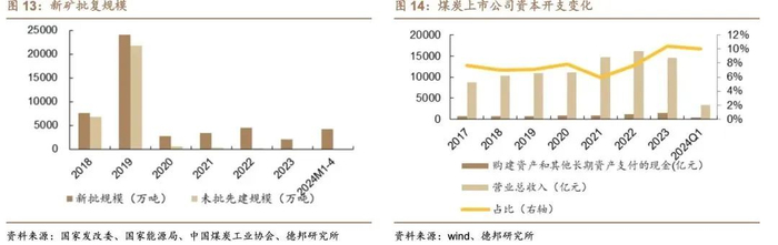 新矿批复规模下降,中长期产能增长或缺弹性。从供给和过往供给比较来看,差异体现在新矿批复数量上。根据发改委和能源局数据,新煤矿批复规模自 2019 年以来出现下降,2020年到2024年4月底之间新批建设煤矿产能 1.7 亿吨,剔除未批先建煤矿后规模合计 1.60 亿吨,占 2023 年煤炭产量仅 3.4%,且建设周期较长。从上市公司角度来看,资本开支意愿较低。煤炭产量的增长长期依赖于固定资产投资,整体建设周期较长。当前,我国在实行“双碳战略”以及“政策限价”的大环境下,企业对盈利空间及远期盈利时间难以判断,投资意愿较弱。煤炭资产资本开支主要以扩建为主,新建矿产减少,新增供给有限,可以推断未来几年煤炭供给释放将是较为缓慢的过程。