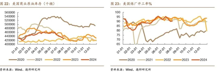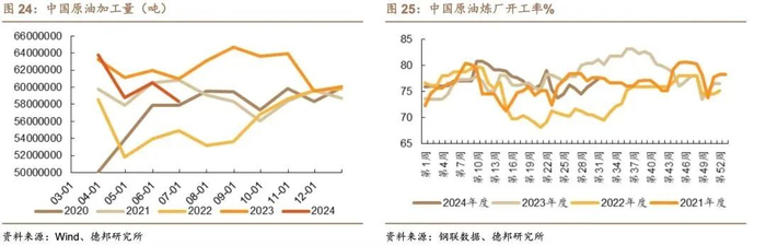 供需紧平衡不改,油价短期易涨难跌。从供给端看,在6月欧佩克会议上,为维护国际石油市场的稳定与平衡,8个欧佩克和非欧佩克产油国决定今年第三季度继续自愿减产,把2023年11月宣布的日均220万桶的自愿减产措施延长至今年9月底,预计减产总额为日均385万桶。同时,8国将把去年4月宣布的日均165万桶的自愿减产措施延长至2025年底。当前,美国商业原油库存已触及历史低位,供给收缩态势延续。需求方面,成品油需求进入夏季高峰期,美国炼厂开工率高位震荡。国内方面, 7月30日,政治局会议再次强调加快发行专项债,三季度发行和实物工作量形成有望加快,叠加部分地区洪涝灾害重建,下游需求有待政策效能释放,金九银十预期下国内柴油用油需求旺季,我们认为油价短期易涨难跌。