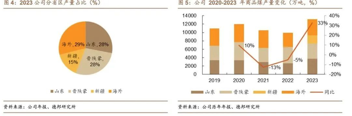 公司煤炭开采起步于山东,逐步向中西部资源富集省区布局。分区域看,2023年公司山东区域产煤3742万吨,晋陕蒙区域合计产煤3646万吨,新疆区域产煤1936.2万吨,分别占总产量比 28%/28%/15%;海外业务贡献产量3886.5万吨,占总产量 29%。