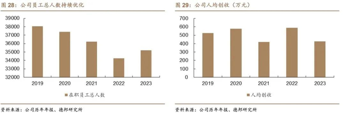 智能化建设促减本增效,人工成本压降显著。自2021年公司发布《发展战略纲要》以来,公司在矿业方面提出以安全、绿色、智能、高效“四型”矿井建设为方向,落实智能化示范矿井升级改造。根据2023年年报披露,7对国家首批智能化示范矿井全部通过验收;新建59个智能化采掘工作面,智能开采占比达94%。截至23年前三季度,采掘工人劳动强度降低50%以上。2022年,员工总人数同比减少5.5%,人均创收同比提升39.8%。尽管2023年员工总人数因新疆能化和鲁西矿业资产注入,同比增加2.7%,但相较于2020年,公司员工总数同比减少5.8%。