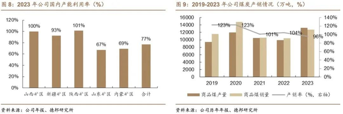 未来公司煤炭产销将继续上升:1)万福煤矿&五彩湾四号露天矿未来正式投建后产能有望持续释放;2)2023 年公司国内产能利用率仅77%,随着营盘壕、石拉乌素及在产项目产能爬坡,煤炭产能利用率有望逐步提高。