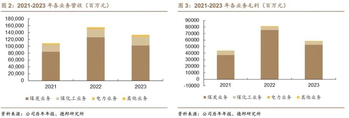 煤炭业务贡献主要利润来源。煤炭生产销售是公司第一大产业,2023年公司煤炭业务实现收入1020亿元,占主营收入占比77%,业务毛利率为52%。受到全年煤价下降影响,毛利率较2022年60%有所下滑,其中自产煤业务收入949.9亿元,同比下降24.99%,煤炭贸易收入为 70.3 亿元,同比下降64%。