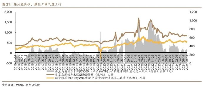 煤化项目盈利能力与国际油价紧密相关,通常在煤炭价格稳定,油价大幅上升时,煤油差收窄,煤化工盈利能力更加凸出。2021年煤油差价均值为448元,处于近几年低位,兖矿股份煤化工毛利率达32%,达到近年来高位。因此煤油价差缩小将一定程度推升煤化工盈利能力提升。