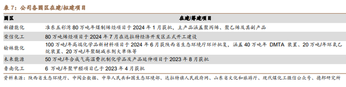 公司按照高端绿色低碳发展方向,延伸现有化工产业链,建设化工新材料研发生产基地,根据2021年发布的《公司发展战略纲要》中提出:力争5-10年化工品年产量达2000万吨以上。2024年1月,新疆能化五彩湾80万吨煤制烯烃项目获批,6月100万吨/年高端化学品新材料环评获批,7月荣信化工80万吨煤制烯烃项目正式开工,随着规划及在建化工园区项目落地,公司化工业绩有望增厚。