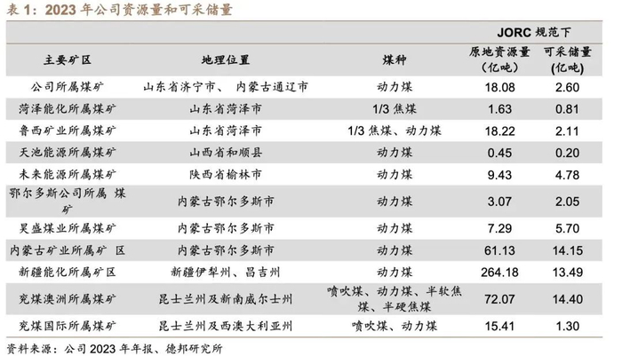 所属矿区地域优势显著,储量充足。公司煤炭储量属于高品质煤炭,具有特低灰、特低磷、特低硫和高发热量的特点,涵盖了动力煤、1/3焦煤、喷吹煤、半软焦煤和半硬焦煤等多种类型,广泛应用于电力、化肥和冶金等多个行业。公司近年来持续优化区域布局和资源配置,提出“三大会战”和“八大工程”的战略规划,将集中优势资源加强陕蒙区域开发建设,全面带动集团整体产业布局优化。截至2023 年,公司境内国家标准资源量为383.48亿吨、可采储量 45.89 亿吨,其中优势采煤区晋陕蒙及新疆分别占44、22%。澳洲基地可采储量为15.7 亿吨。
