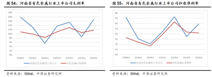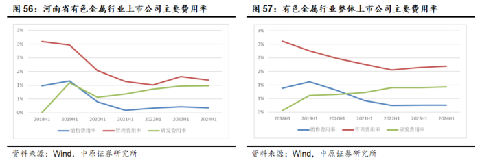 费用率方面,河南省有色金属行业上市公司2024H1的销售费用率、管理费用率、研发费用率分别为0.17%、1.19%、0.98%,有色金属行业整体的销售费用率、管理费用率、研发费用率分别为0.26%、1.69%、0.93%,虽然有色金属行业整体的费用率略高于河南省内的有色金属上市公司,但由于各项费用率的占比较低,总体对利润端的影响不大。