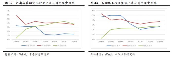 费用率方面,河南省基础化工上市公司2024H1的销售费用率、管理费用率、研发费用率分别为1.30%、3.68%、3.76%,基础化工行业整体的销售费用率、管理费用率、研发费用率分别为2.65%、3.71%、2.79%。与行业整体相比,河南省基础化工上市公司销售费用的管控能力更强,管理费用与行业基本持平,研发费用投入显著高于行业整体。