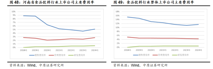 费用率方面,河南省食品饮料行业上市公司2024H1的销售费用率、管理费用率、研发费用率分别为5.11%、2.73%、0.48%,食品饮料行业整体的销售费用率、管理费用率、研发费用率分别为11.52%、4.29%、0.65%。与行业整体相比,河南省上市公司的销售费用率和管理费用率均明显更低,研发费用率与行业整体基本持平。