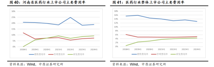 费用率方面,河南省医药上市公司2024H1的销售费用率、管理费用率、研发费用率分别为18.82%、7.29%、9.22%,医药行业整体的销售费用率、管理费用率、研发费用率分别为12.77%、5.03%、4.37%。相比于行业整体,河南医药上市公司的销售费用率、管理费用率和研发费用率均不同程度高于行业整体,其中销售费用率和研发费用率分别高出6.05pct和4.85pct。