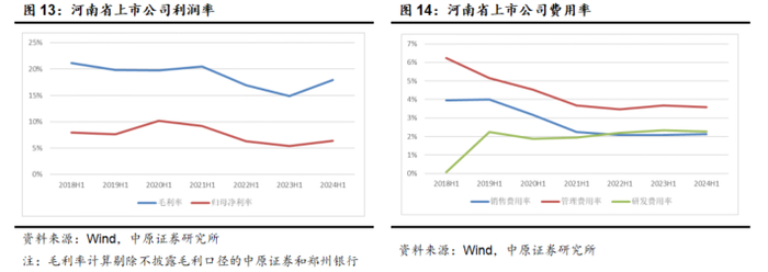 在费用率层面,自2021上半年以来,河南省上市公司的整体费用水平较为稳定,2024H1销售费用率2.12%,管理费用率3.57%,研发费用率2.27%,合计为7.96%,同比下滑0.12pct,2021年以来河南省上市公司整体的费用率基本保持稳定。