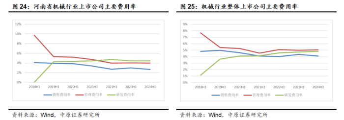 费用率方面,河南省机械上市公司2024H1的销售费用率、管理费用率、研发费用率分别为2.64%、3.96%、4.43%,机械行业整体的销售费用率、管理费用率、研发费用率分别为4.10%、5.04%、4.80%,与行业整体相比,河南省机械上市公司的费用管控能力更强。