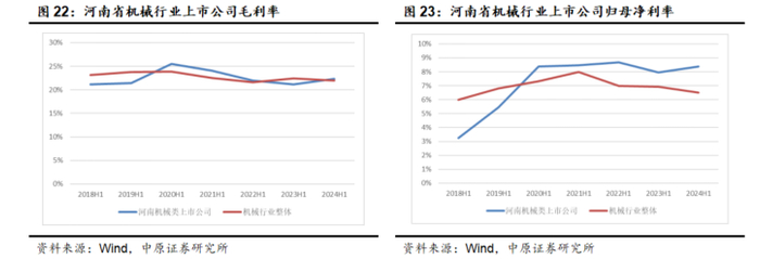 盈利能力方面,2024H1河南省机械上市公司整体毛利率22.35%,同比提升1.21pct,归母净利率8.39%,同比提升0.43pct;相比机械板块整体21.95%的毛利率和6.50%的归母净利率,河南省机械上市公司的盈利能力更强,分别高出0.40pct和1.89pct。