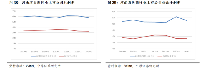 盈利能力方面,2024H1河南省医药类上市公司整体毛利率57.96%,同比下滑3.10pct,归母净利率22.62%,同比下滑3.21pct。相比医药行业整体32.74%的毛利率和8.19%的净利率,河南省医药行业上市公司的盈利能力明显更强,分别高出25.22pct和14.43pct。