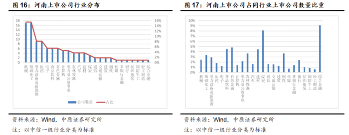 从河南上市公司的行业分布来看,以中信一级行业分类为标准,机械行业和基础化工行业公司各17家,电力设备及新能源行业和医药行业各9家,电子行业、食品饮料行业、有色金属行业各6家,计算机行业、电力及公用事业行业各5家,农林牧渔行业、汽车行业、建材行业各4家,其余行业上市公司数量较少。