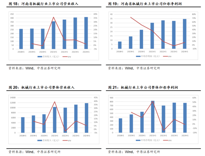 与行业整体相比,河南省上市公司数量占机械行业整体数量的比重为2.46%,营业收入占比为3.49%,归母净利润占比为4.50%;在增速方面,河南省的机械上市公司营业收入增速虽然低于行业整体,但利润增速高于行业整体。