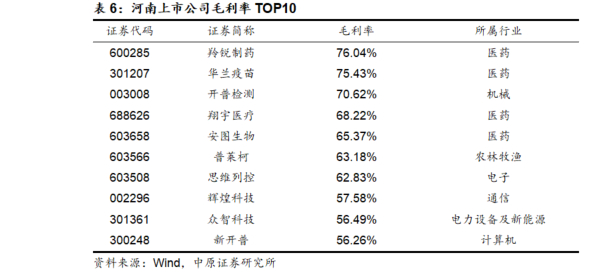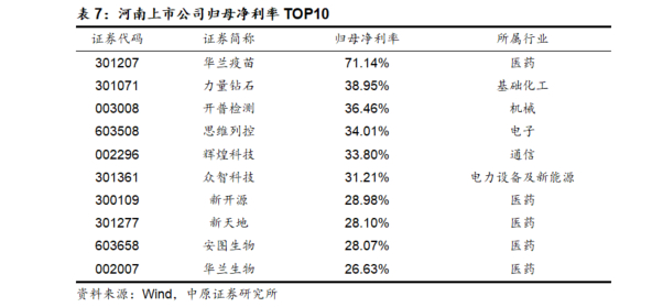 在归母净利率方面,2024H1华兰疫苗归母净利率达到71.14%,显著领先于其他河南上市公司;力量钻石、开普检测、思维列控、辉煌科技、众智科技5家公司归母净利率高于30%。从行业分布来看,归母净利率TOP10的公司中,医药行业占比50%。