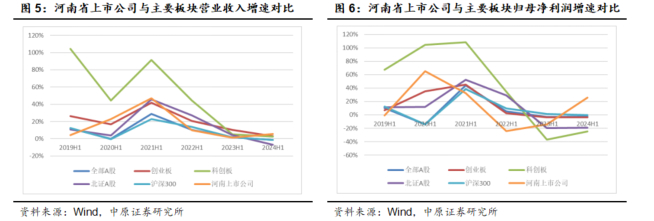 进一步对比创业板、科创板、沪深300以及北证A股等主要板块或指数在2024上半年的业绩变化情况,河南省上市公司的整体业绩增速也明显较好。