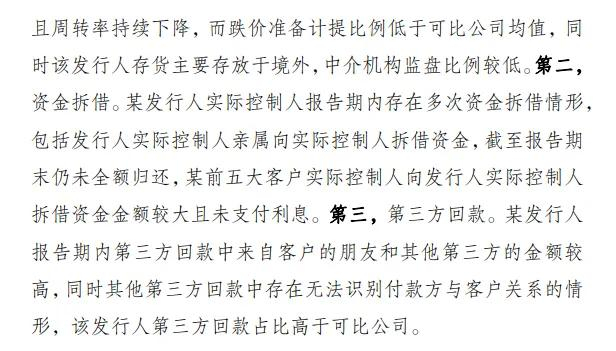 第二,资金拆借。某发行人实际控制人报告期内存在多次资金拆借情形,包括发行人实际控制人亲属向实际控制人拆借资金,截至报告期末仍未全额归还,某前五大客户实际控制人向发行人实际控制人拆借资金金额较大且未支付利息。
