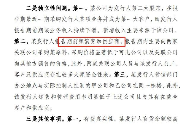 第二,某发行人报告期前频繁变动供应商,报告期内主要向两家关联公司采购某原料,采购价格显著低于可比公司以及关联公司向其他方销售的价格,此外,两家关联公司人员与该发行人员工、客户及供应商存在较多大额资金往来。