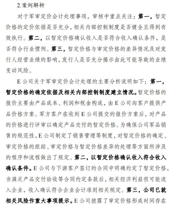 E公司关于军审定价会计处理的主要分析说明如下:第一,暂定价格的确定依据及相关内部控制制度建立情况。暂定价格的报价主要由产品成本、利润和税金构成,由E公司向客户提供产品价格方案。军方客户在收到E公司提交的报价方案后,对产品的价格进行评审以确定产品交付的暂定价格。为确保公司军品销售的规范性,E公司制定了销售管理等制度,对暂定价格的确定、审定价格的跟踪、审定价格与暂定价格差异的处理等方面所涉及的程序和流程做出了规定。第二,以暂定价格确认收入符合收入确认条件。E公司与下游客户签订的合同中明确约定了暂定价格,当满足产品交付验收等合同约定条款后,相关经济利益很可能流入企业,收入确认符合企业会计准则相关规定。第三,公司已就相关风险作重大事项提示。E公司披露了审定价格形成时间存在不确定性的风险、审价结果对于公司经营业绩影响存在不确定性的风险并作重大事项提示。目前,E公司已发行上市。
