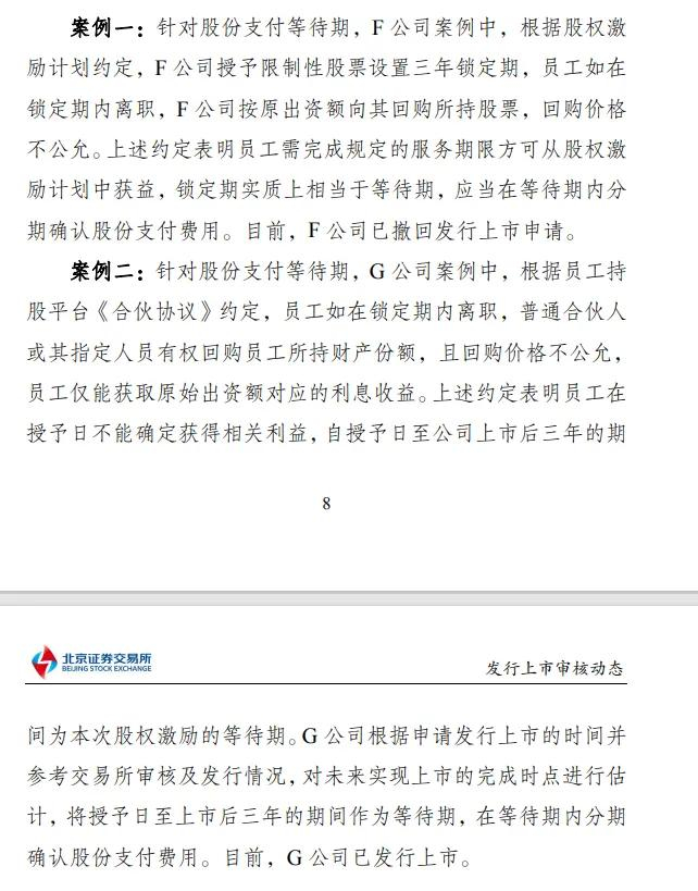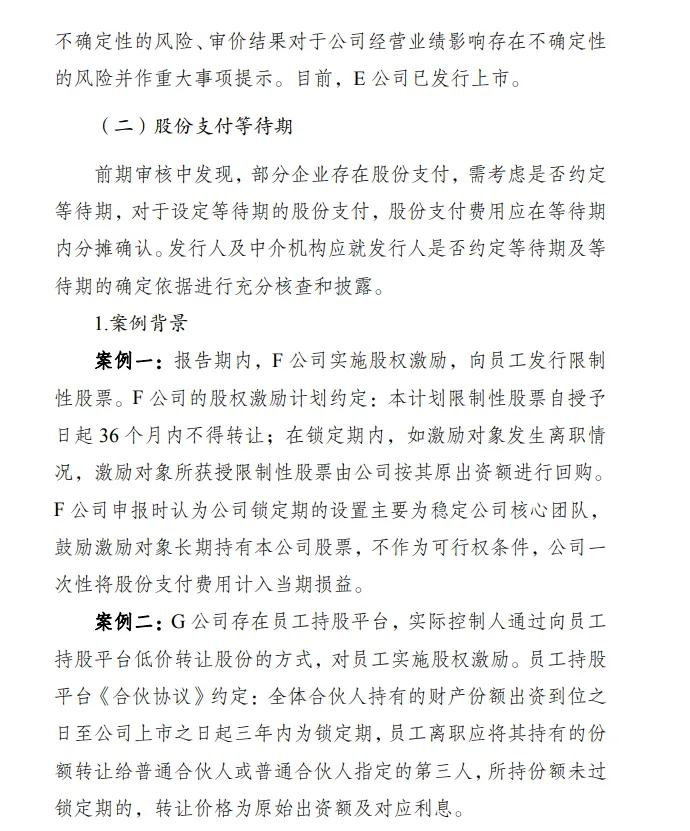 案例一:针对股份支付等待期。F公司案例中,根据股权激励计划约定,F公司授予限制性股票设置三年锁定期,员工如在锁定期内离职,F公司按原出资额向其回购所持股票,回购价格不公允。上述约定表明员工需完成规定的服务期限方可从股权激励计划中获益,锁定期实质上相当于等待期,应当在等待期内分期确认股份支付费用。目前,F公司已撤回发行上市申请。