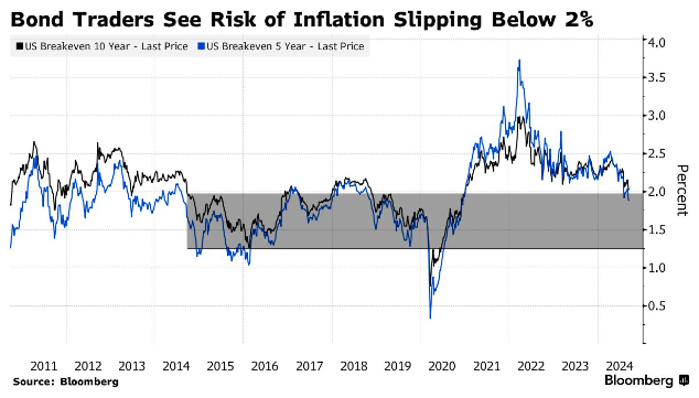 这表明投资者认为未来十年的平均通胀率很可能将低于美联储2%的目标,因为从历史上看,CPI比美联储首选的通胀指标——PCE物价指数往往会高出约0.4个百分点。