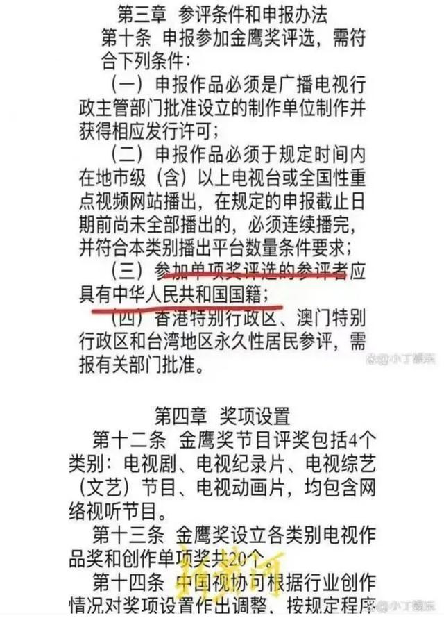 公开资料显示,金鹰奖评选规定之一,要求参评者必须具备中国国籍,港澳台地区参评者需要有关部门批准。违法失德艺人和其参演的作品都不得参与评选。