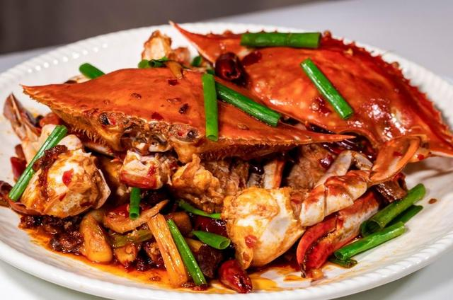 2、香辣梭子蟹:先将蟹切块,裹上淀粉炸至金黄。锅中留底油,放入干辣椒、花椒、姜蒜爆香,加入蟹块翻炒,调入适量生抽、盐、糖、料酒,翻炒均匀,让香辣滋味充分渗透到蟹肉中。