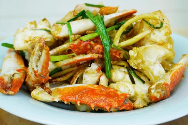 3、姜葱炒梭子蟹:蟹切块,锅中热油,放入姜片和葱段煸炒出香味,加入蟹块快速翻炒,淋上少许水淀粉勾芡,使蟹肉更加嫩滑。