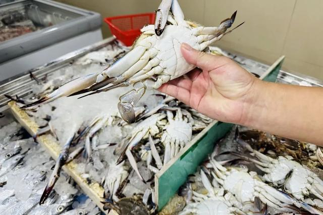 挑选梭子蟹也有一番学问。要选择蟹壳青中带蓝、蟹腹洁白、不能发黑、蟹脐饱满的个体,另外可以看蟹的肚脐和两个尖角的地方,是否有浅红色,颜色越深越好,这样的梭子蟹肉质更肥美。