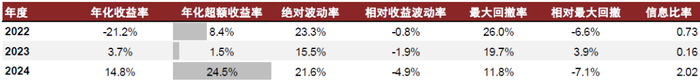 在过去三年,该策略连续相对基准指数实现了超额收益,在风险管理和波动性控制方面表现优异,充分展示了其作为长期投资工具的价值。2022年尽管整体市场表现疲软,该策略仍取得了8.4%的超额收益,显示出其在市场下行中的抗跌能力。同时,策略的最大回撤率低于基准,进一步证明了其防御特性。2023年,策略在稳健收益的基础上实现了1.5%的超额收益,尽管信息比率较低,但波动性显著低于基准,表现出良好的风险控制能力。进入2024年,策略表现尤为亮眼,超额收益率达24.5%,在相对较低波动性和更低回撤率的支持下,信息比率达2.02,表明策略在市场上涨过程中具备较高的风险调整后回报。