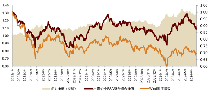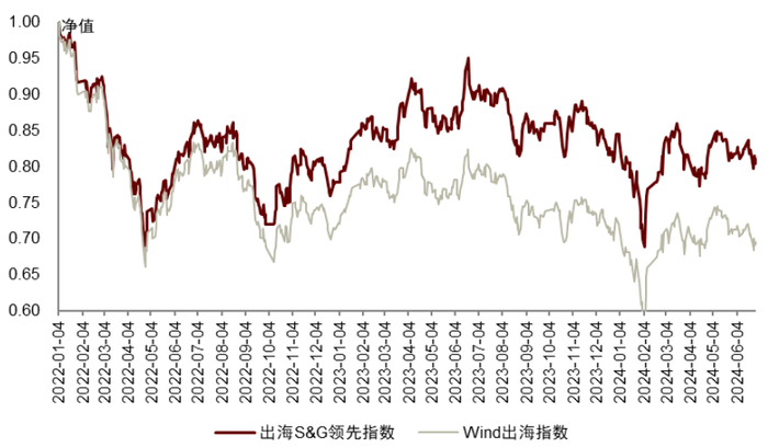 注:出海S&G领先指数是指在Wind出海指数成分股的基础上选取行业内中金ESG评级体系中,S维度和G维度排名都在前50%的公司,时间区间为2022年1月1日-2024年6月30日