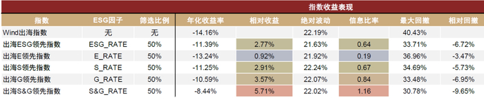 ESG负面筛选策略:在ESG负面筛选策略中,我们以不同维度的中金ESG评级得分为因子,剔除Wind出海指数成分股中,各行业内ESG评级排名在后50%的公司,构建多种出海企业ESG领先指数。在收益表现上,2022年1月1日-2024年6月30日,出海S&G领先指数的表现突出,年化超额收益率为5.71%,信息比率为1.16,风险控制上,该策略的绝对波动和最大回撤指标表现均显著优于基准指数,体现了在投资中有效整合S和G因素对投资组合带来的正面影响。除了E因子之外,通过ESG、S、G三大因子进行单独负面筛选也能够增强收益,降低组合风险。