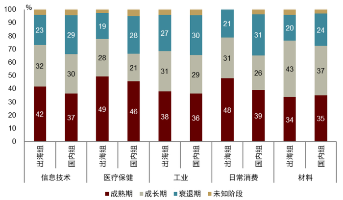 图表11:2023年,出海组企业与国内组企业不同生命周期占比