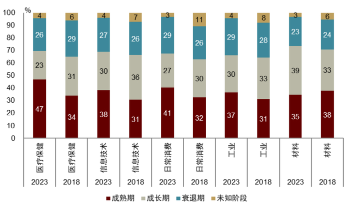 图表10:2018年和2023年,前五大GICS一级出海行业企业生命周期数量占比变化