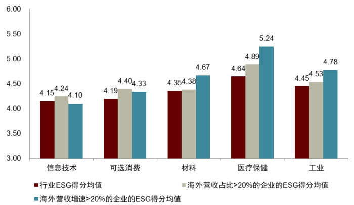 图表8:前五大GICS一级出海行业中,按海外营收占比和海外营收增速分组的中金ESG得分均值