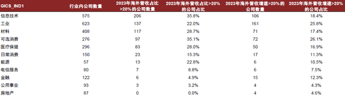 图表7:2023年,GICS一级行业中A股上市公司海外营收占比及增速情况