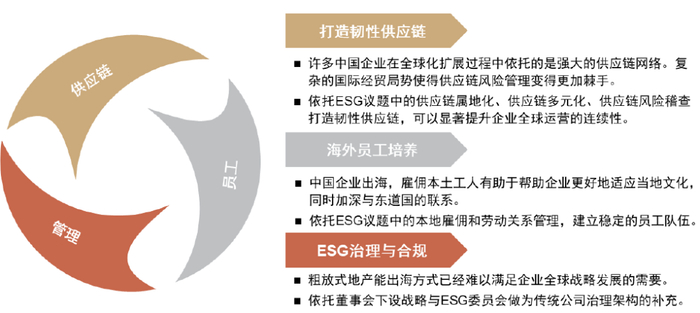 出海企业所处的生命周期和行业特征不同决定了其全球化布局的战略重心和具体业务的开展形式有所区别。但总体而言,中国出海企业需要借助ESG战略,在供应链、员工培养和ESG治理与合规三大维度上进行针对性地提升,从而更好地适应海外环境,实现全球资源的优化配置和公司运营的长期稳健。