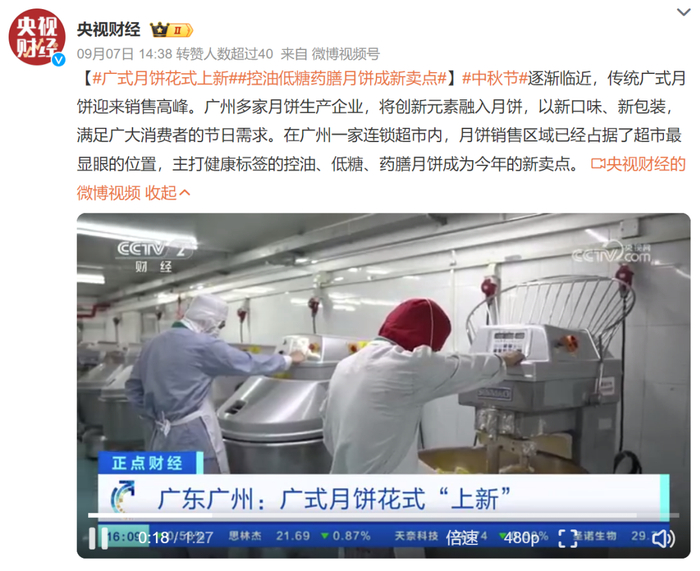 央视财经报道称,广式月饼花式“上新”,主打控油、低糖、药膳月饼成新卖点。