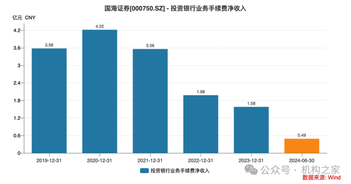 具体来看,2024年上半年,国海证券仅完成1家再融资项目和1家新三板挂牌项目,在固定收益融资业务方面也仅成功发行7只债券,累计承销规模22.24亿元。这一数据反映出国海证券在项目储备、执行能力和市场竞争力方面均面临更加严峻的考验。