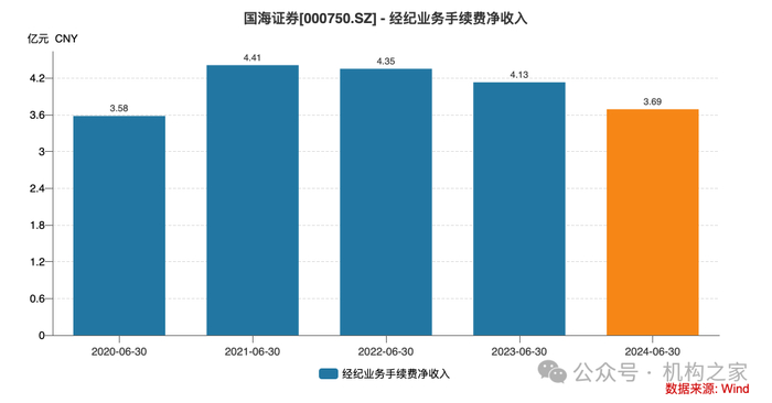 除投行业务外,国海证券的经纪业务也延续了近年来的下滑态势。2024年上半年,公司经纪业务手续费收入为3.69亿元,同比下跌10.71%。这已是该业务连续第三个半年报出现下滑。2022年半年报、2023年半年报经纪业务手续费收入分别为4.35亿元、4.13亿元,分别同比下跌1.39%、5.04%。而2024年下滑的幅度进一步加深,反映出国海证券在激烈的经纪业务竞争中正逐渐失去竞争力。