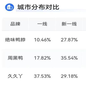此外,也有店员指出,“绝味的渠道与价格存在矛盾。” 据了解,绝味鸭脖渠道较其他同行最突出的特点就是“下沉”。业内人士表示,相较于以直营模式为主的其他品牌,绝味的加盟模式使其在在渠道下沉和市场扩张方面具有天然的优势。根据窄门餐饮数据,在城市分布上,绝味鸭脖在二线以下的店铺分布比例远高于周黑鸭等其他鸭脖品牌;而在选址分布上,绝味鸭脖乡镇店的比重也远大于其他企业。