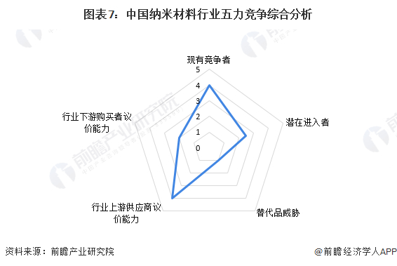 根据以上分析,对各方面的竞争情况进行量化,5代表最大,0代表最小,目前我国纳米材料行业五力竞争总结如下: