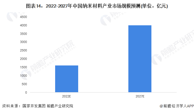根据国家开发投资集团有限公司预测,未来几年,中国新材料产业将延续过去高速增长的强劲势头,到2025年产值将突破10万亿元,发展前景十分广阔;前瞻在此基础上进一步预测,到2026年中国新材料产值将达到11.7万亿元左右。伴随新材料产业市场发展,未来纳米材料市场规模也将进一步提升。在生产技术的积累以及下游应用市场进一步推广的环境下,纳米材料未来有望在基础工业材料以及显示器零件的细分市场上有所突破,带动整体市场规模在2025年突破3000亿元,2027年预计接近4000亿元。