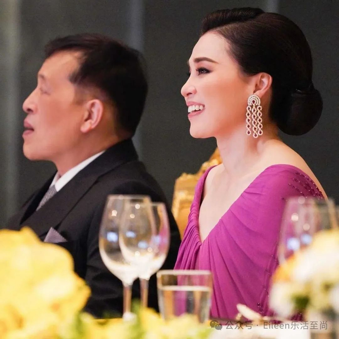 这几天,泰王后素提达很风光,8月25日陪同泰王主持晚宴,一身紫红色晚礼服,配着造型别致的红宝钻石耳环,雍容华贵。